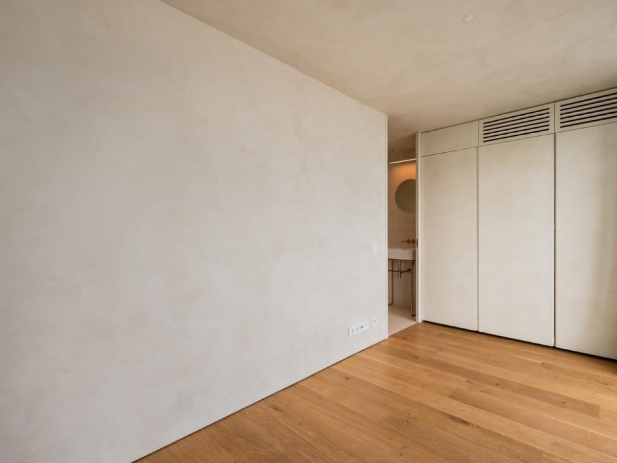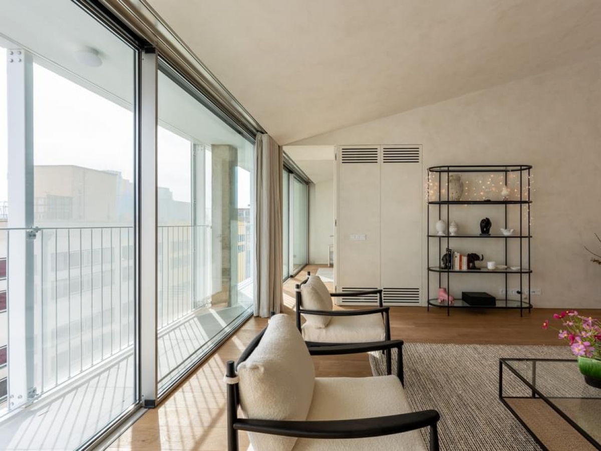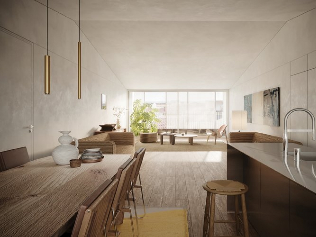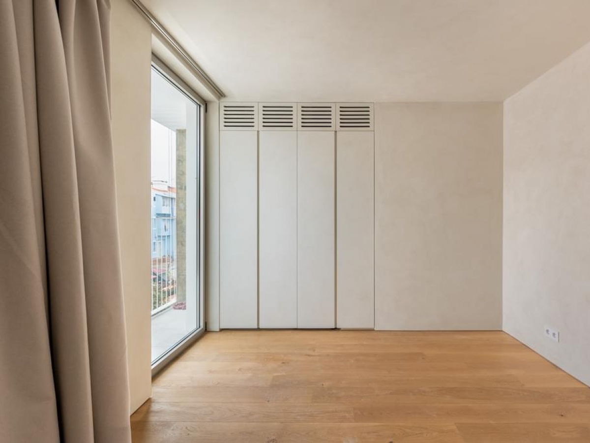 The building is divided into eight apartments, two per floor. This T1 has a huge living room perfect for gatherings and spending time with the family, a spacious and modern fully equipped kitchen that connects to the private garden and parking. With its large windows you also have the privilege of having a beautiful view and receiving natural sunlight at the same time.